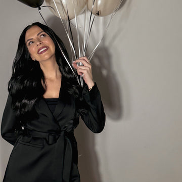 Ich trage unsere Tape In Extensions Classic in der Länge 60cm und der Farbe 1B Schwarzbraun.